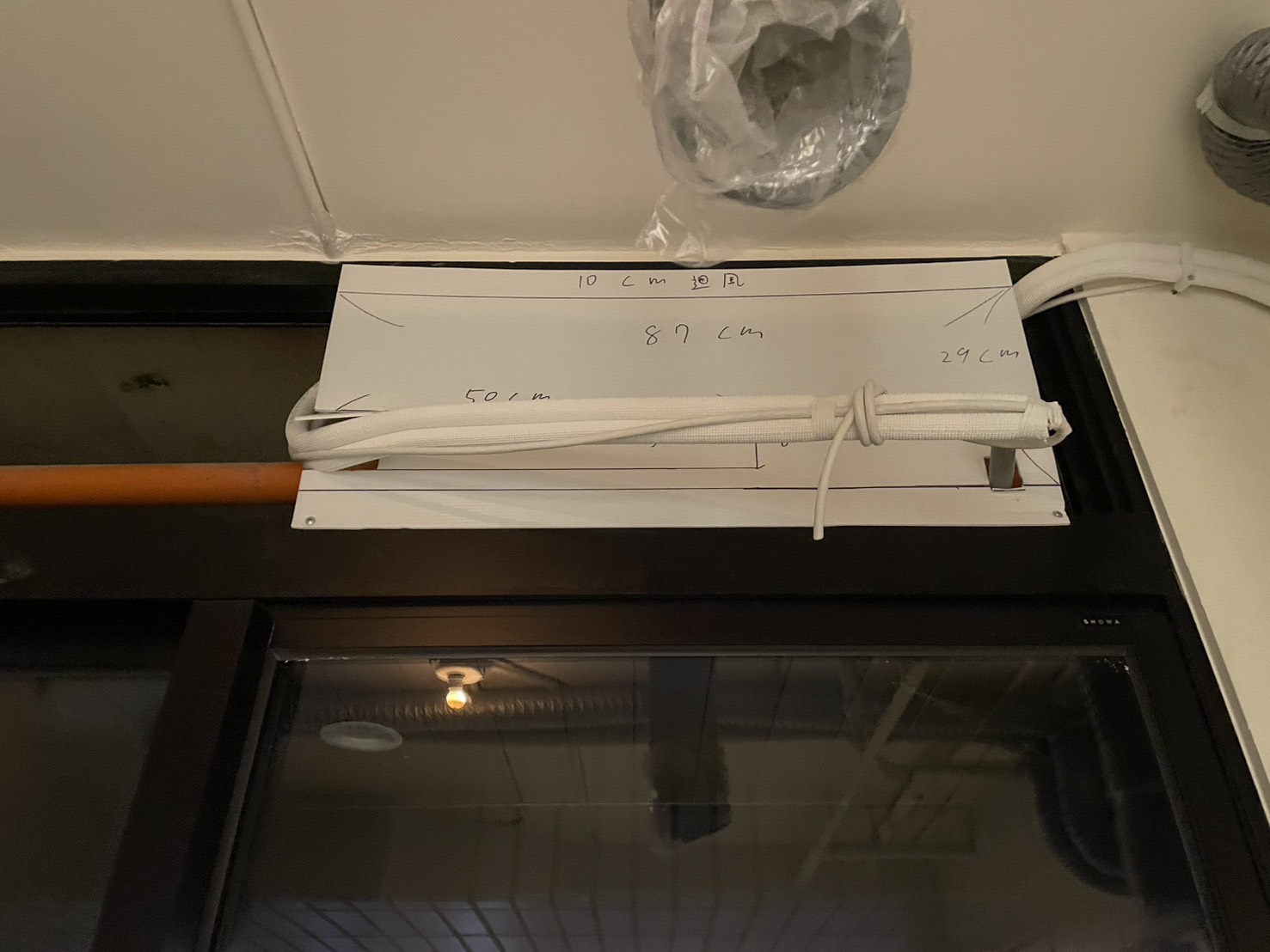 在評估後,我們決定不使用大樓原有的排水路徑,而是改由前陽台的落水孔作為主要排水方向。該戶有三個前陽台,每個陽台皆設有落水孔,且其中一側上方為玻璃氣窗,因此我們透過拆除氣窗玻璃,將設備配置調整至靠近陽台的位置。