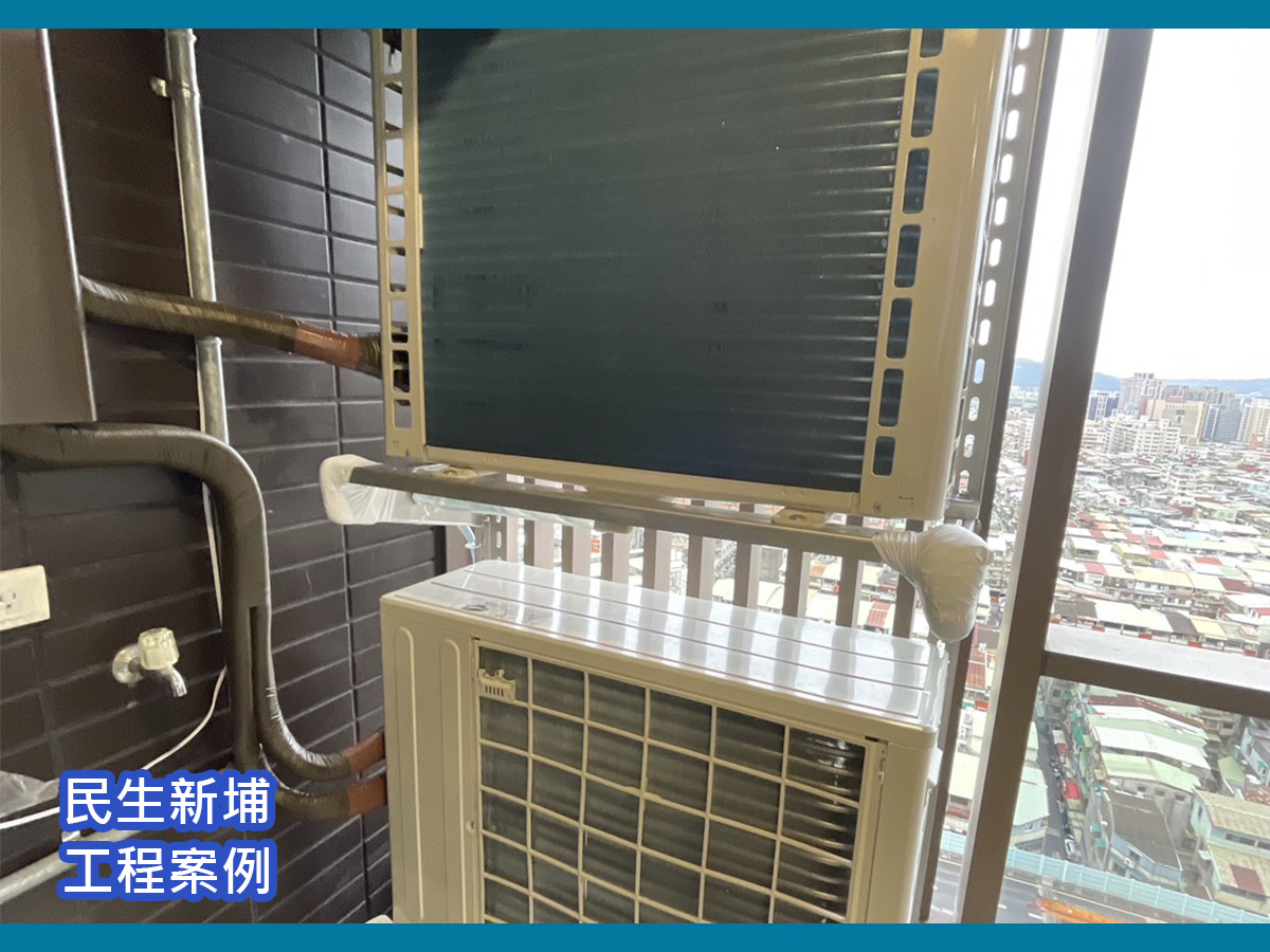 本案為板橋民生新埔新成屋(客廳+兩房),因排水集中廁所且高度受限、管線集中導致天花與維修空間不足,昇宏改採前陽台落水孔為主要排水並分流配置:客廳全熱、次臥除濕,完成全熱+除濕+冷氣三系統整合,兩天完工並順利銜接裝修。