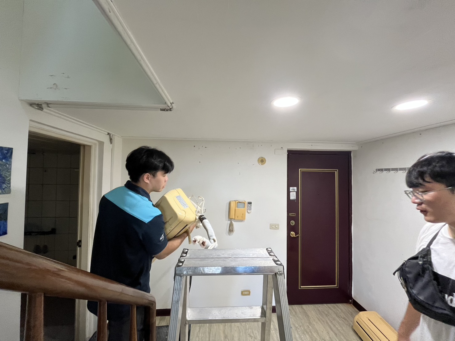 這戶原本為單一樓層空間,但屋主將其隔成樓中樓使用。原本的排水條件並不完整,因此每一台冷氣皆使用排水器作為排水方式。